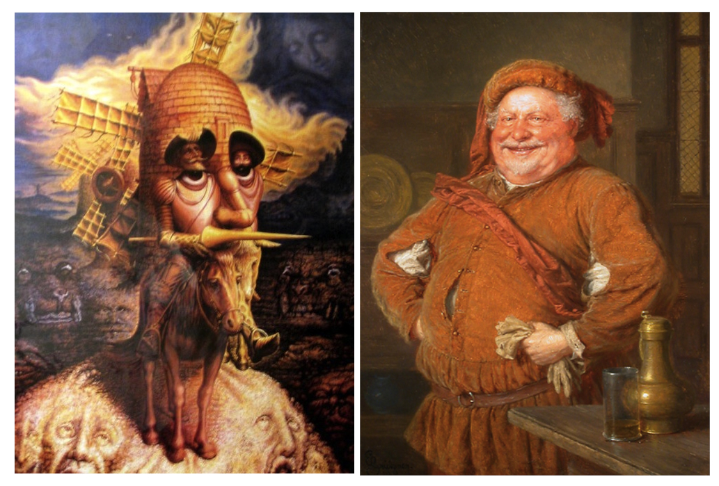 El Falstaff de Shakespeare (personaje de The Merry Wives of Windsor y los enriques) fue ese gordo lujurioso, tallero y cobarde, ese flan liberal de pub que festinaba con el honor y que en la ópera de Verdi consiguió un aria referida a este asunto. Falstaff es sin duda la muestra simétricamente contraria al Quijote. Es un gordo —“pacífico” por cuanto gordo, como hubiese dicho Cervantes— calculador, divertido, burlesco; un Sancho Panza emancipado de sus funciones escuderiles, y que ostenta el título de Sir. Don Quijote es “enjuto de rostro”, alto, autoerigido como observante de las reglas de caballería, muchas de las cuales desprende de meras lecturas.